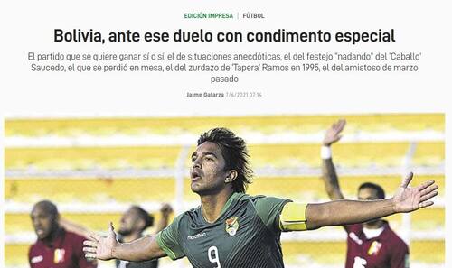 "Bolivia, ante ese duelo con condimento especial", se titula la nota mencionada. En su interior, los bolivianos indican que el duelo ante Chile es "un partido con sabor especial, sin duda. Un clásico para el fútbol nacional en competencias internacionales. Es de esos partidos que despiertan un interés distinto, mayor, como cuando toca enfrentar a Argentina".