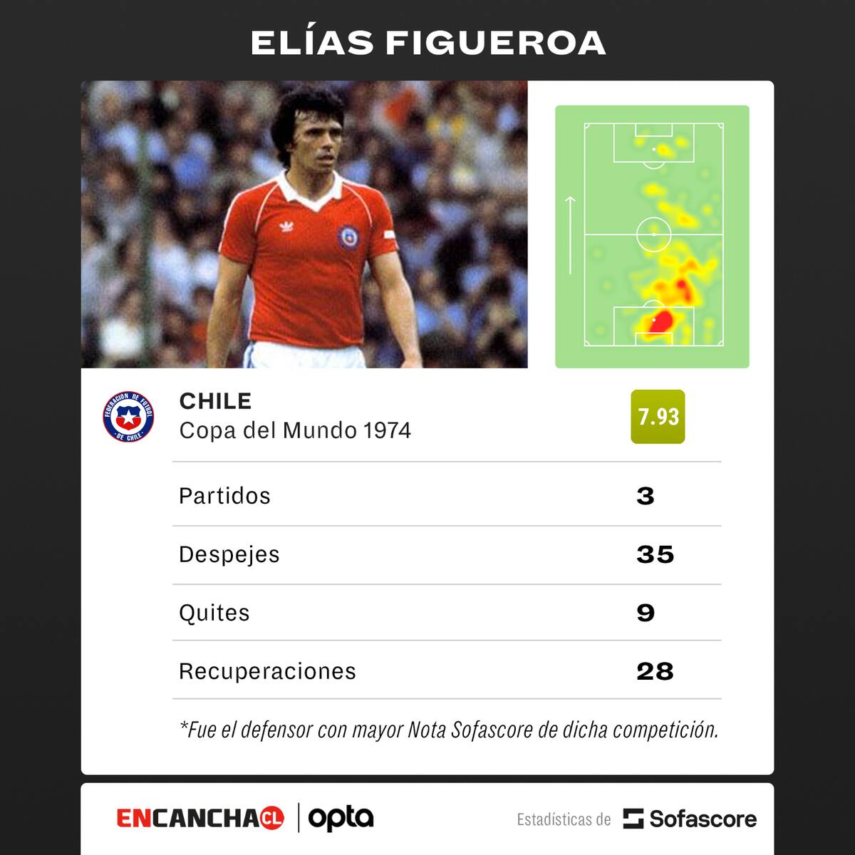 Según los datos de Sofascore, que reúne las notas y calificaciones de todos los Mundiales desde 1966, Elías Figueroa fue el mejor defensa de esa Copa del Mundo disputada en Alemania. Nada menor, considerando que en ese torneo también participaron leyendas de la zaga como Franz Beckenbauer, Ruud Krol, Roberto Perfumo o Carlos Alberto, por nombrar sólo a algunos.