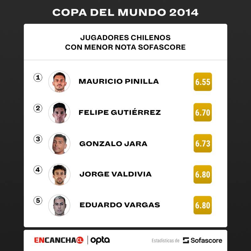 Curiosamente, el rendimiento más bajo tuvo directa relación con una de las imágenes más icónicas de La Roja el 2014: "El Palo de Pinilla" ante los locales en octavos de final. El exdelantero de la U y hoy comentarista registró el índice más bajo, superando apenas a Felipe Gutiérrez y Gonzalo Jara.