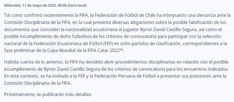 Aunque esto último generó dudas con la respuesta que dio la FIFA este miércoles 11 de mayo, ya que si bien se acaban de "abrir procedimientos disciplinarios en relación con el posible incumplimiento de Byron David Castillo Segura de los criterios de convocatoria para los encuentros indicados", desde Zurich invitaron a presentar posiciones a la Federación Ecuatoriana de Fútbol (FEF) y a la Federación Peruana de Fútbol (FPF).