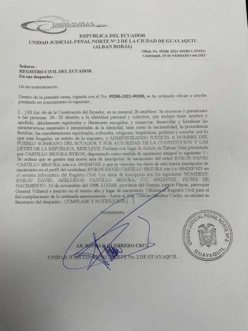 Donde Acosta hace hincapié es en la resolución de febrero de 2021, en que el Registro Civil de Ecuador declara que Byron David Castillo Segura es ciudadano ecuatoriano. A partir de allí, cualquier intento chileno por desacreditar tal condición sería inútil. "Este jugador inició un proceso en Ecuador para obtener el reconocimiento de que es ciudadano natural de ese país, que ha nacido en Ecuador. Ese procedimiento terminó con una sentencia judicial que reconoció su nacimiento y ordenó su inscripción en el Registro Civil. Ese acto jurídico, a partir de una sentencia judicial, forma parte del ordenamiento normativo interno de Ecuador y no ha sido objeto de ninguna apelación".