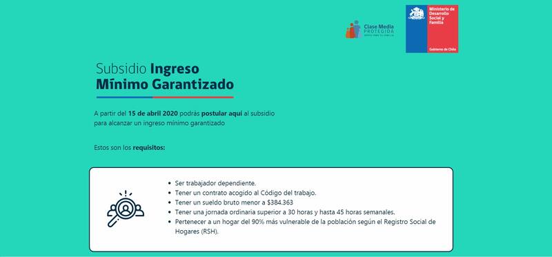 El Ingreso Mínimo Garantizado, es un subsidio dependiente del Ministerio de Desarrollo Social y Familia. En donde deberás llenar el formulario respectivo y esperar la confirmación de parte de la entidad.