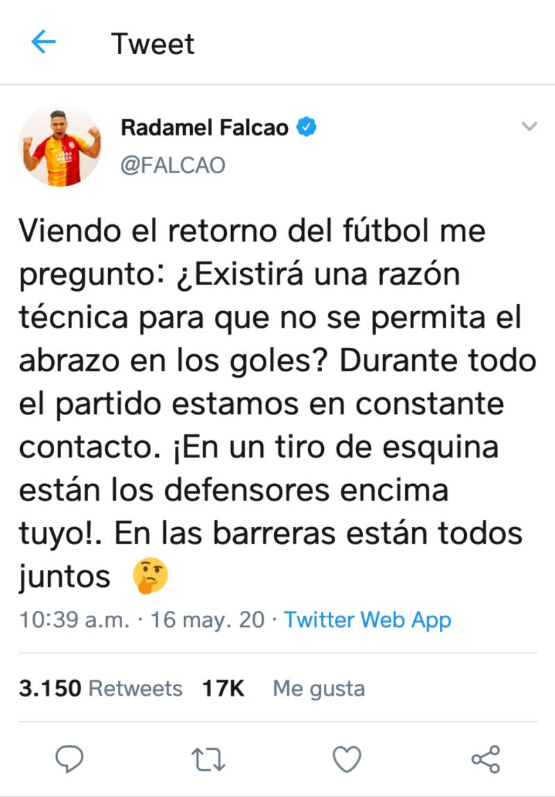 Radamel Falcao, ídolo de la selección colombiana, a traves de su cuenta de Twitter al retorno de las competencias a nivel mundial. El jugador del Galatasaray cuestionó los protocolos de seguridad creados para evitar posibles nuevos contagios tanto entre jugadores como hinchas que asistirán a los estadios una vez que el fútbol esté de regreso. Sobre todo las medidas que buscan restringir en contacto físico entre los futbolistas.