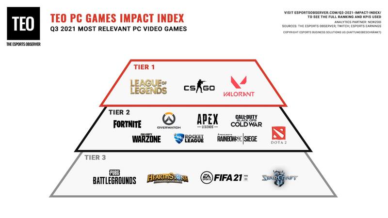 Riot Games lidera este ranking con League of Legends, para luego tener a Valorant en la tercera ubicación, mientras que Counter-Strike: Global Offensive de Valve está en el segundo puesto. Los tres juegos se encuentran en la cateogría Tier 1, que son los preferidos de los usuarios.