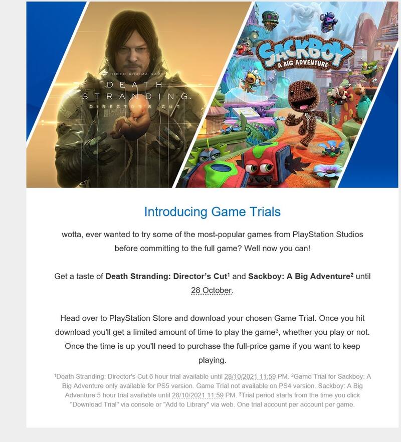 Los juegos gratis que Sony dispondrá para los usuarios de PlayStation 5 serán Death Stranding Directors Cut y Sackboy: A Big Adventure, los debutantes de la modalidad Game Trials, la cual será tener diversos títulos por un tiempo determinado.