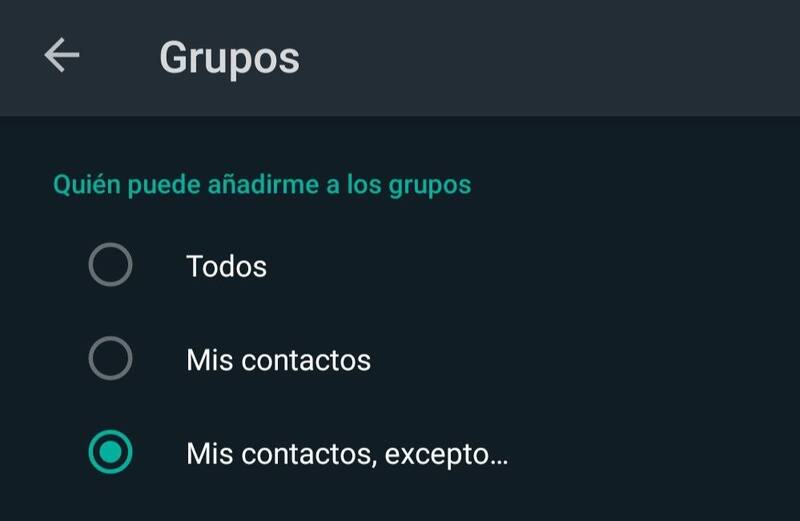 En primer lugar, debes iniciar la aplicación de WhatsApp y dirigirte a Configuraciones (ícono de tres puntos en la parte superior derecha). Luego debes pinchar en las siguientes opciones: Ajustes -> Cuenta -> Privacidad -> Grupos. Luego de esto se puede cambiar la opción "Todos" a "Mis contactos", o "Mis contactos, excepto…".