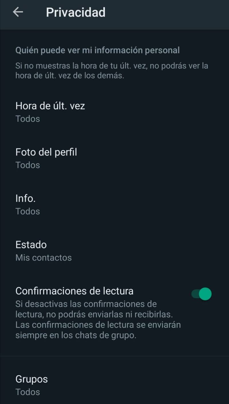 Tras entrar a los ajustes de la app, se debe entrar a cuenta y luego privacidad, donde están las siguientes opciones: