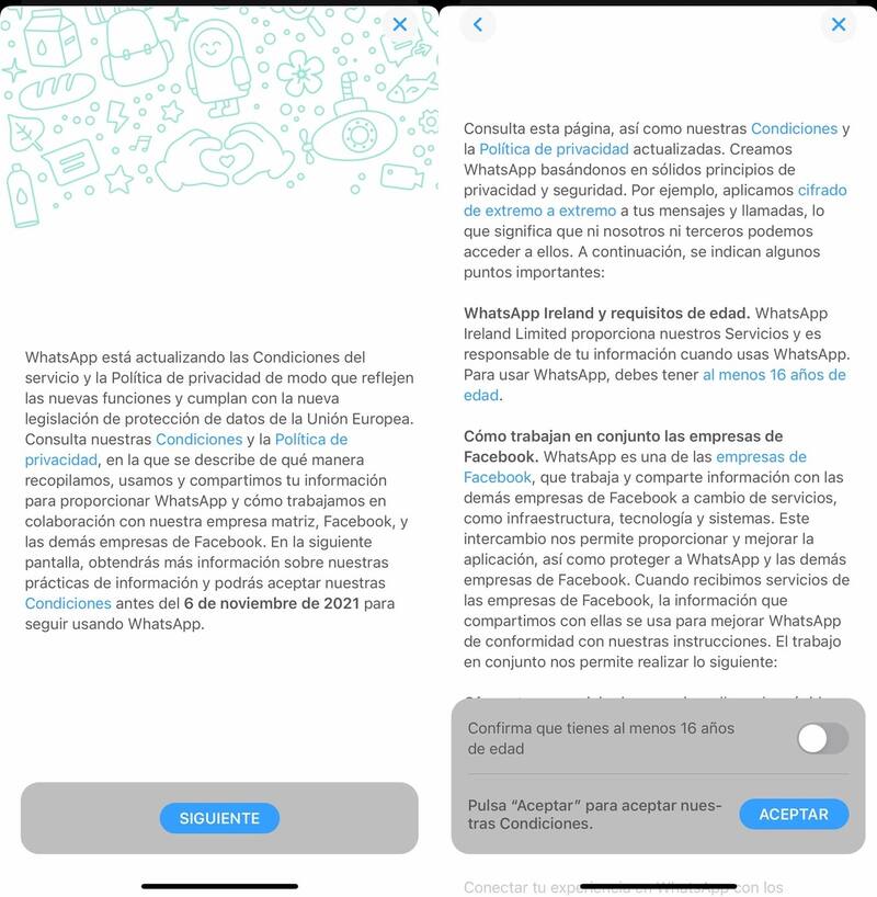 "WhatsApp está actualizando las Condiciones del Servicio y la Política de Privacidad, de modo que reflejen las nuevas funciones y cumplan con la nueva legislación de protección de datos de la Unión Europea. (...) WhatsApp es una de las empresas de Facebook, que trabaja y comparte información con las demás empresas a cambio de servicios como infraestructura, tecnología y sistemas", indicó WhatsApp en un comunicado recogido por la web Xataka.