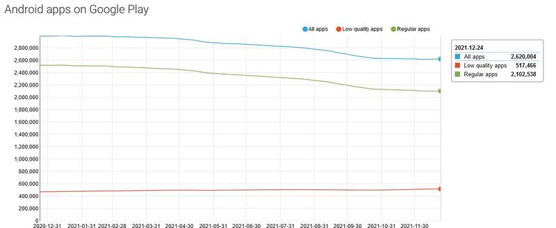 El sitio web Appbrain realizó un estudio de la cantidad de apps en Google Play durante los últimos dos años y que se actualiza diariamente, analizando el total de softwares que hay disponibles. La última estadística medida en esta plataforma fue el pasado 24 de diciembre, en la que hubo un total de 2.620.004 aplicaciones.