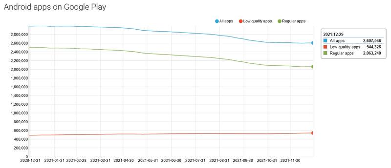 El sitio web Appbrain realizó un estudio que se actualiza todos los días acerca del número de apps en Google Play durante los últimos dos años, analizando el total de softwares que hay disponibles. La última estadística medida en esta plataforma fue el pasado 29 de diciembre, en la que hubo un total de 2.607.566 aplicaciones.