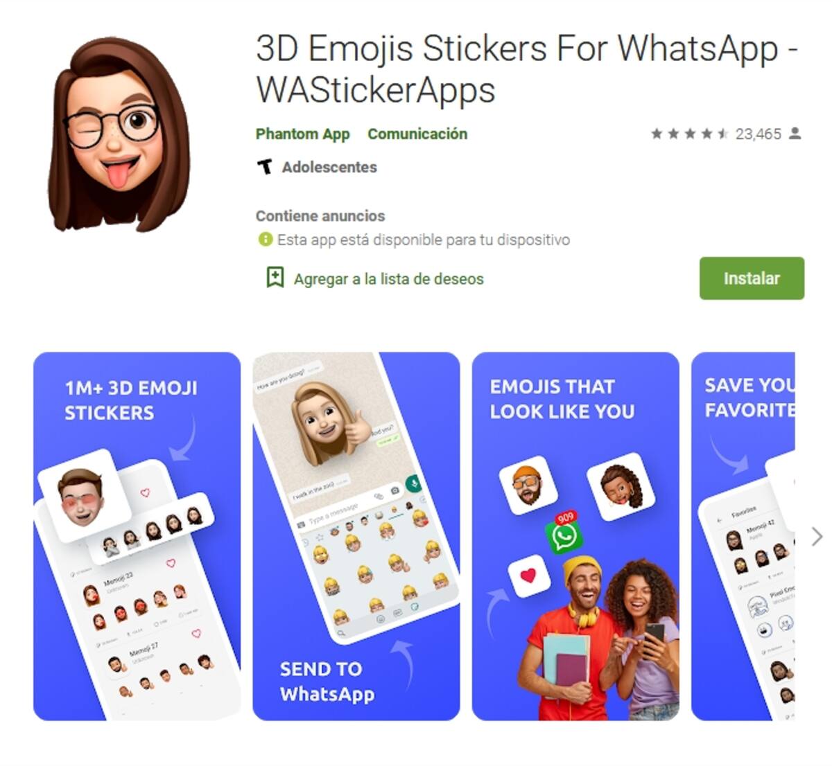- 3D Emojis Stickers For WhatsApp – WAStickerApps: Aplicación para la descarga de stickers en WhatsApp. La especialidad son los Animojis de Apple y un catálogo variado, mucho más grande que la App anterior. Disponible en Google Play.