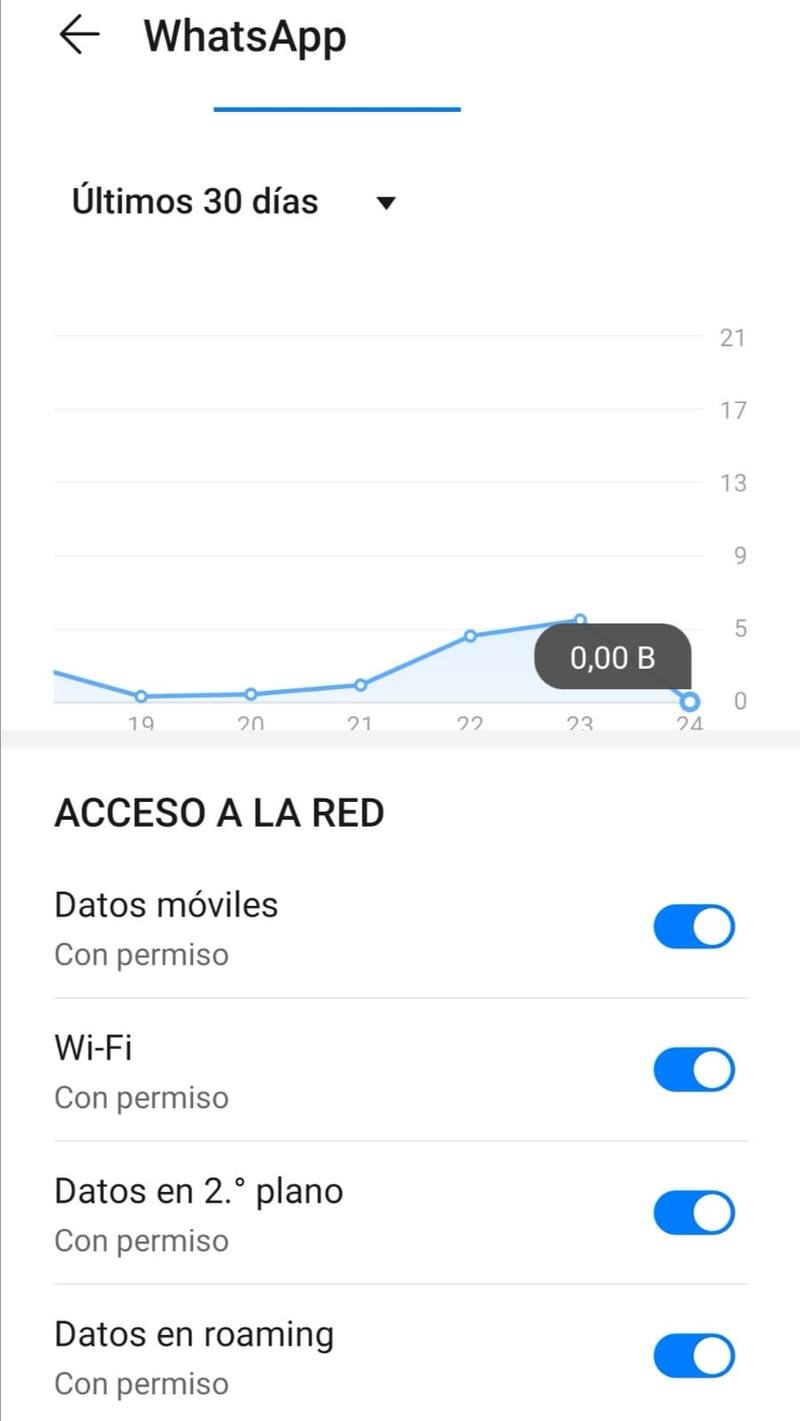 - Entrar a la sección "uso de datos" y asegurar que los datos móviles, Wifi y Datos en segundo plano estén activados.