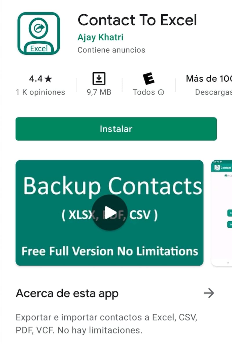 - Ingresar a Google Play y descargar la App "Contact to Excel".