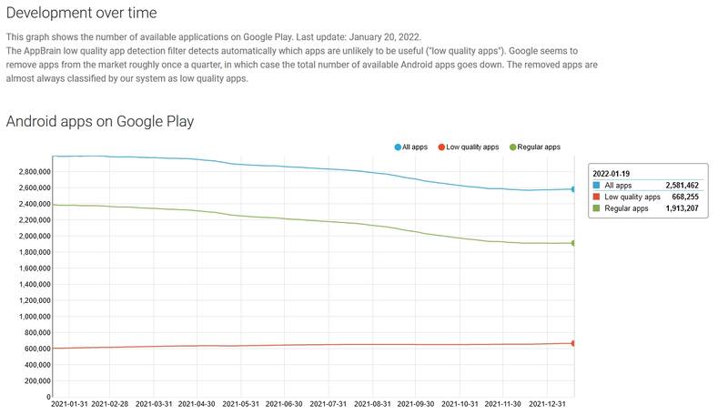 El sitio web Appbrain realizó un estudio que se actualiza todos los días acerca del número de apps en Google Play durante los últimos dos años, analizando el total de softwares que hay disponibles. La última estadística medida en esta plataforma fue el pasado 22 de enero, en la que hubo un total de 2.580.799 aplicaciones.