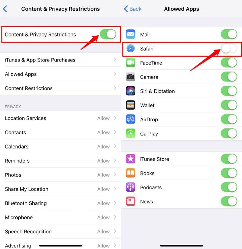- Tras eso, se debe habilitar el botón que refleja las restricciones de contenido y privacidad del iPhone.