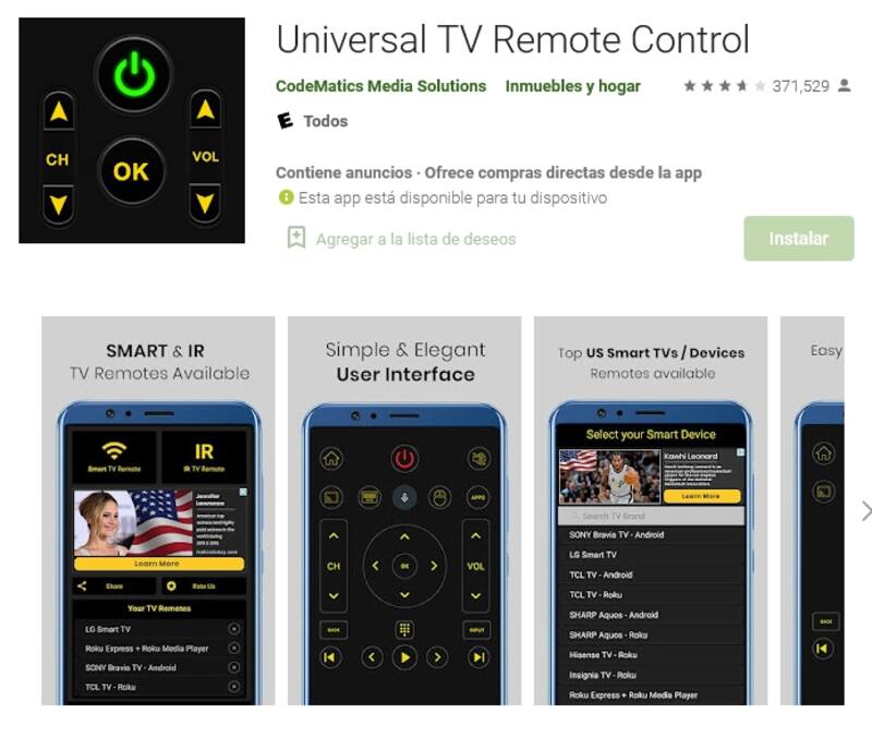 - Al abrir la app, se debe escoger la marca y modelo del control remoto a emular.