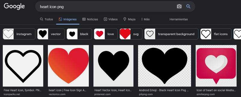 El primer paso antes de realizar este sencillo paso a paso para modificar el ícono verde de WhatsApp es buscar en Google el nombre de cualquier foto en formato PNG (fondo transparente). En el buscador se recomienda escribir "heart icon png" e ir al ítem imágenes.
