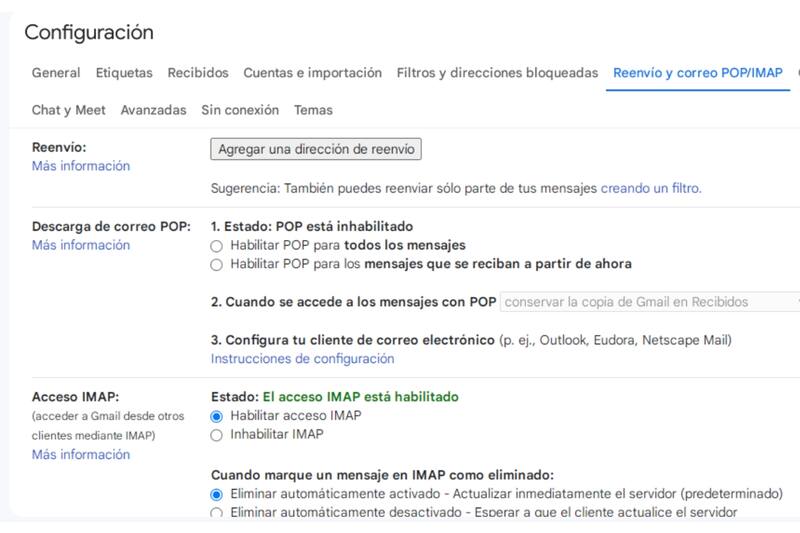 Ve a la pestaña "Reenvío y POP/IMAP".