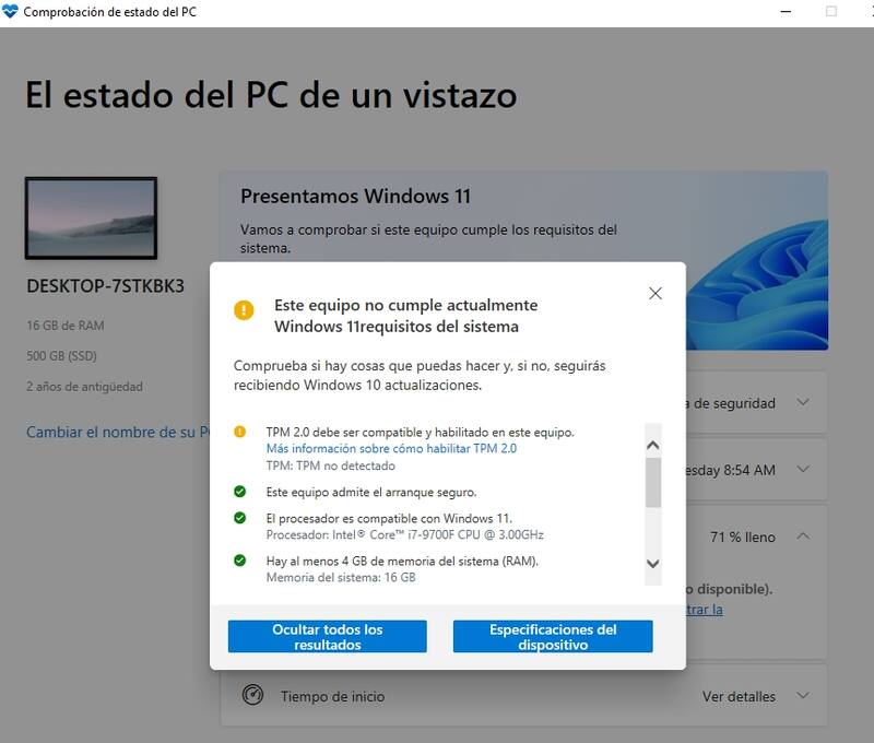 PC Health Check realiza un análisis al computador del usuario, indicando con detalles si se cumple con los requisitos mínimos para una próxima instalación de Windows 11. Si dentro de los exámenes, aparece un punto amarillo, el computador no sería compatible con la plataforma.
