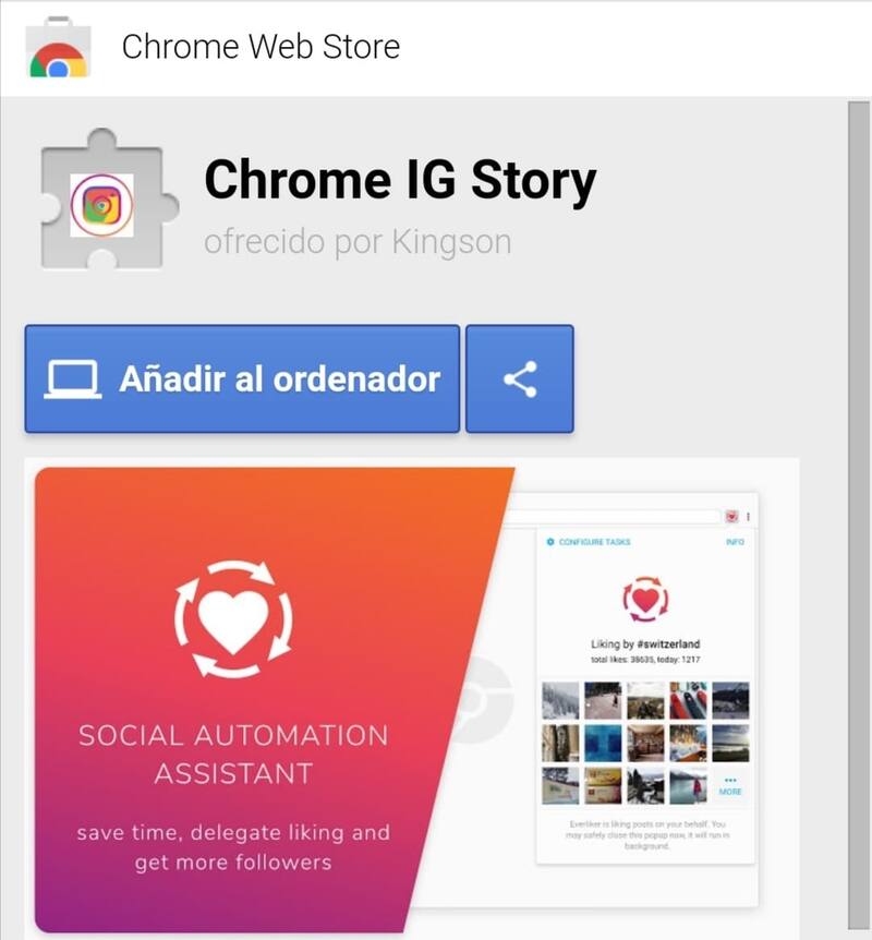 - Descargar la extensión llamada "Chome IG Story" en el navegador web.
