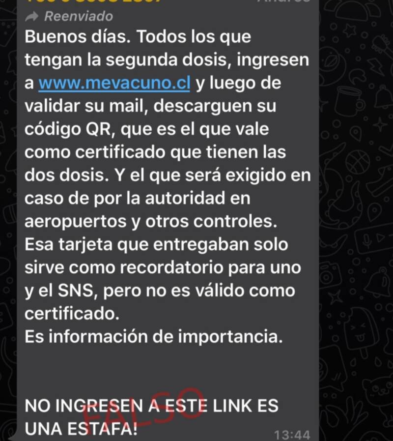 "Hola! por si acaso a los que ya se vacunaron, anda circulando un mensaje falso por whatsapp con un link para pedir certificado de vacunación, le roban a la gente la clave única, el correo, etc… para que no se metan si les llega", es parte de la falsa premisa que ha sido difundida", no hay que hacer caso a este mensaje que se viraliza por el servicio de mensajería.