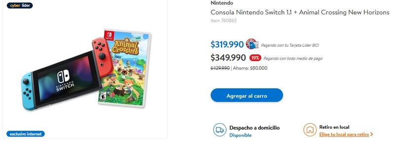 - Nintendo Switch: Esta consola tiene un valor de $319.990 si se paga con tarjeta Líder BCI y $349.990 con cualquier medio de pago. Es la versión normal de la consola con el juego Animal Crossing New Horizons.