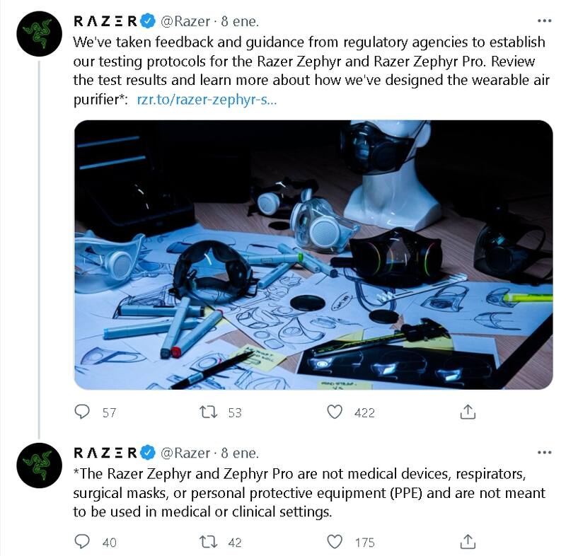Tras ello, la empresa asiática tuvo que reconocer en redes sociales con otro comunicado en el que la mascarilla Razer Zephyr no hace lo que se prometió en un principio. "Razer desea aclarar que, aunque los filtros utilizados en el purificador de aire portátil Razer Zephyr han sido probados para una eficiencia de filtración de partículas (PFE) del 95% y una eficiencia de filtración de bacterias (BFE) del 99%, según las declaraciones en el sitio web y la documentación del producto, el dispositivo portátil por sí mismo no es un dispositivo médico ni está certificado como una máscara N95.", afirmaron en un tweet que luego borraron.