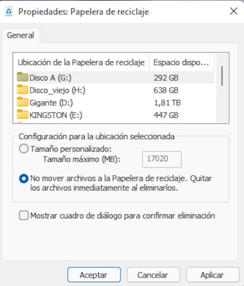 - Allí el usuario debe seleccionar "no mover archivos a la Papelera de reciclaje. Eliminar archivos inmediatamente cuando se elimine la opción".