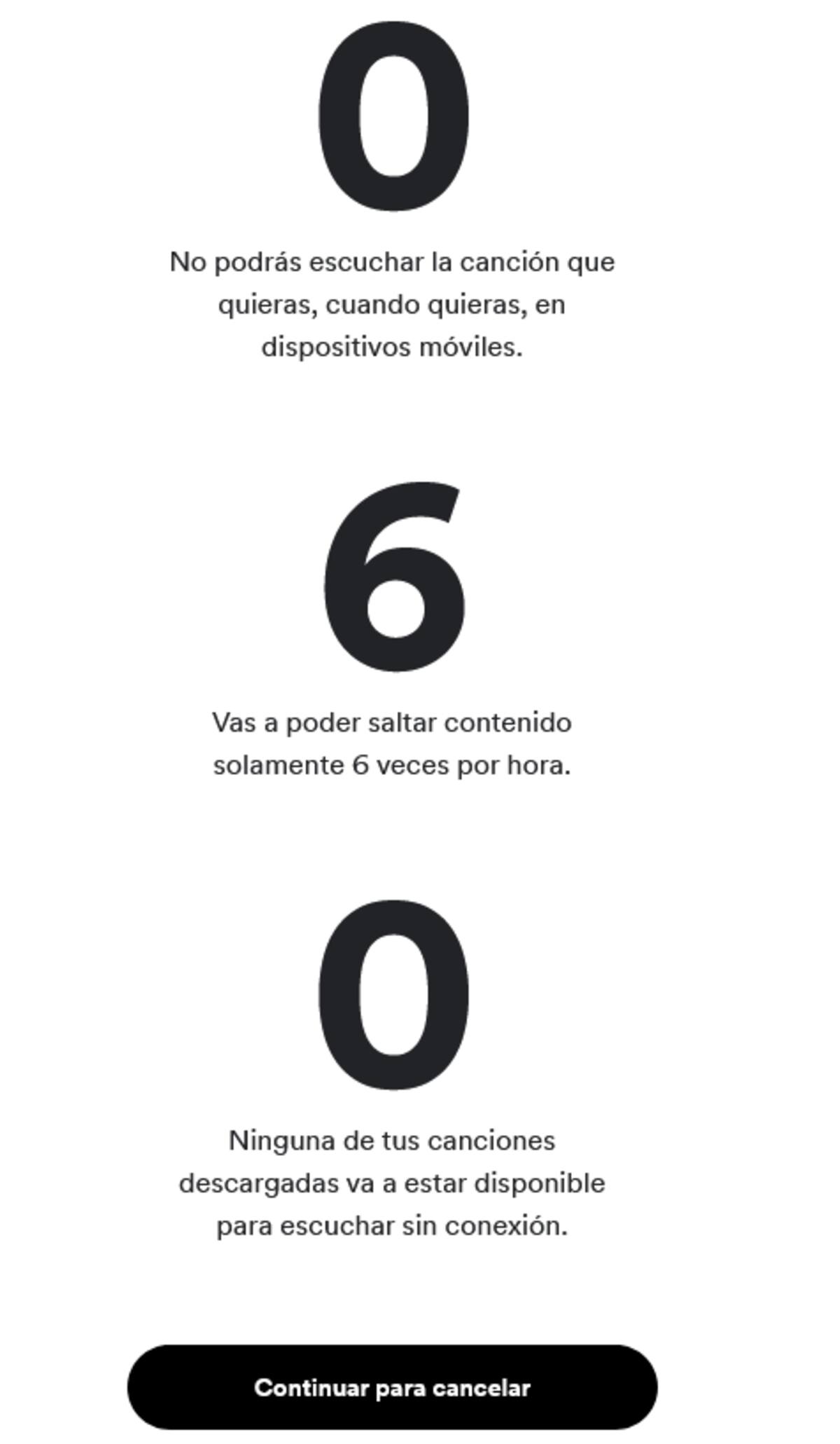 - Al hacer click en aquel botón, el servicio de audio intentará que te quedes con Spotify Premium, ya que mostrará todo lo que ocurre si te quedas con el plan gratis: Comerciales cada 15 minutos, acceso móvil restringido y sin descargas. Baja al final al del sitio y coloca "Continue to cancel" para finalizar con el proceso, el cual entrará en vigencia en la próxima fecha de facturación.