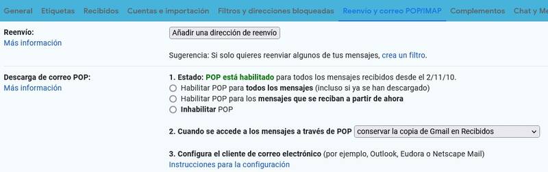 - Revisar la pestaña Reenvío y POP/IMAP.