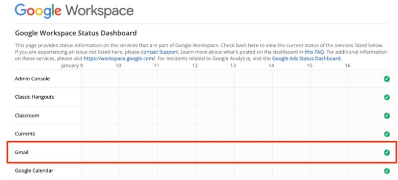 Si el usuario está conectado a Internet y no puede ingresar al servicio Gmail, se recomienda entrar directamente al panel de estado de Google Workspace y corroborar que todo ande sin problemas. Allí debería haber una marca color verde que indica que la app está perfecta, mientras que la amarilla o la roja señalan que hay dificultades.
