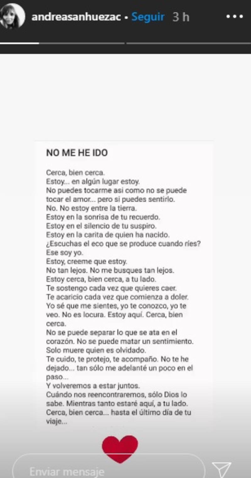 Andrea Sanhueza, viuda de Roberto Bruce, le rindió un emotivo homenaje al periodista. A 9 años de la tragedia de Juan Fernández, la mujer publicó en su cuenta de Instagram un poema que habla de la muerte. "No me he ido. Cerca, bien cerca. Estoy… en algún lugar estoy. No puedes tocarme, así como no se puede tocar el amor…", parte el mensaje subido a sus historias. Recordemos que en 2013 Sanhueza fue criticada por tener una nueva pareja. "Los chilenos tendemos mucho a juzgar y a decir 'oye, pero ¿cómo puede estar tan feliz si se le murió el marido?' (…), 'la viuda alegre' y en realidad sí, uno puede ser súper feliz, puede reírse, puede disfrutar igual. Al final, uno las penas las va guardando», señaló la viuda de Roberto Bruce en el matinal de CHV.