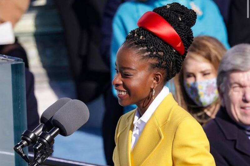 La joven poeta y activista Amanda Gorman en un look de la marca italiana Prada.