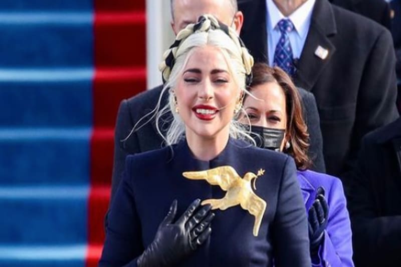 Por su parte, Lady Gaga en Schiaparelli Haute Couture, impactó con el ensamble de chaqueta azul, falda de seda roja y para cerrar; un broche en forma de paloma que simboliza la paz.
