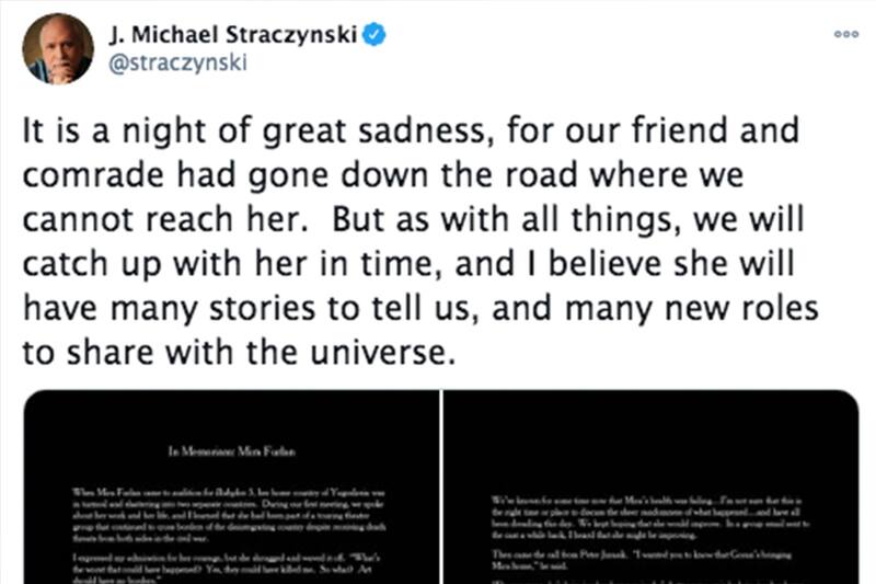 "Es una noche de gran tristeza, porque nuestra amiga y compañera se ha ido por el camino donde no podemos ir con ella. Pero como con todas las cosas, la alcanzaremos a tiempo, y creo que tendrá muchas historias que contarnos y muchos papeles nuevos que compartir con el universo", dijo el creador de "Babylon 5", J. Michael Straczynski, poco luego de conocerse la noticia.