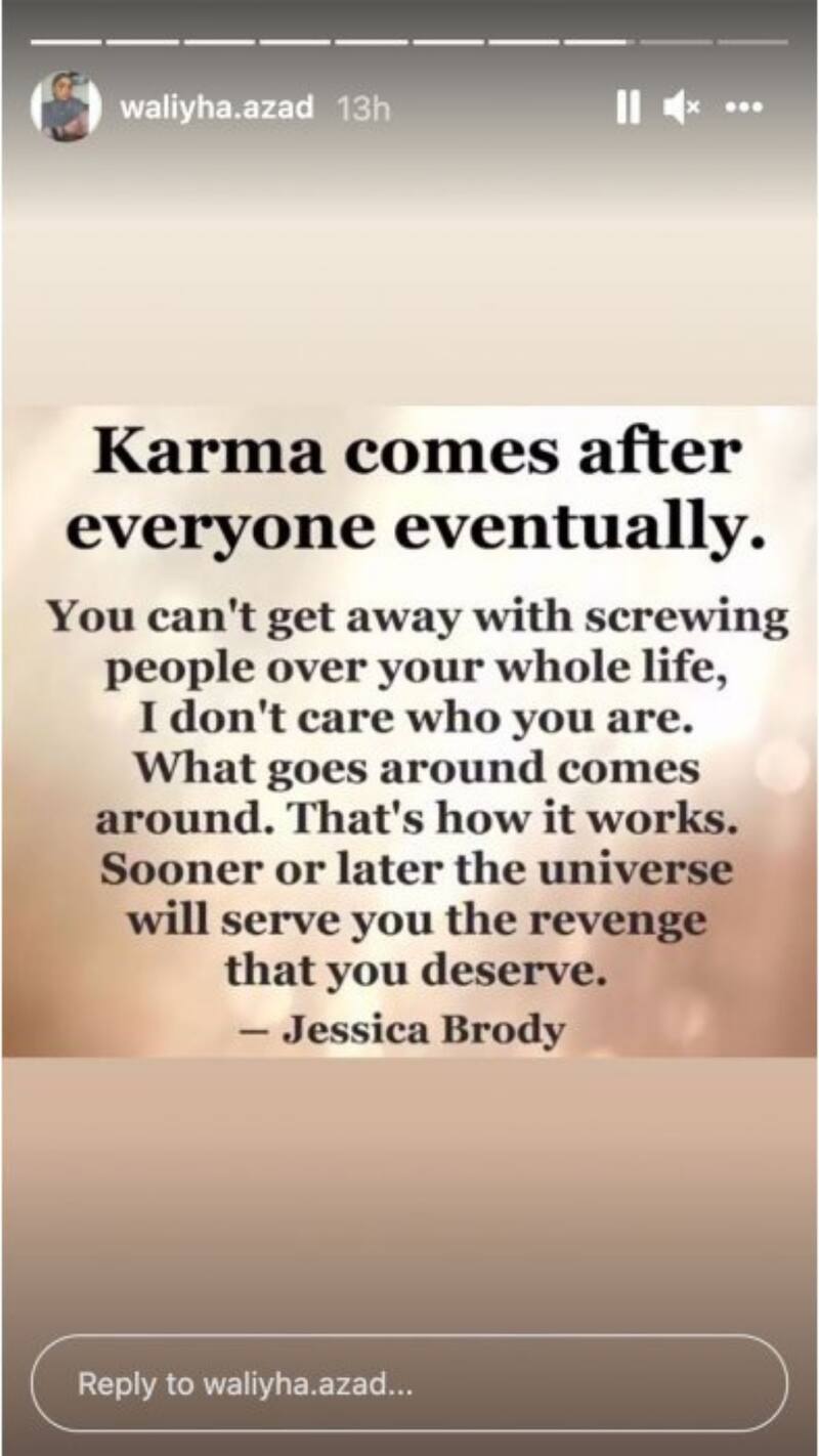 "El karma viene después de todos, eventualmente", se lee en una de las frases que compartió Waliyha Malik en sus historias de Instagram la noche del jueves tras conocerse detalles del conflicto que protagonizó el artista inglés.