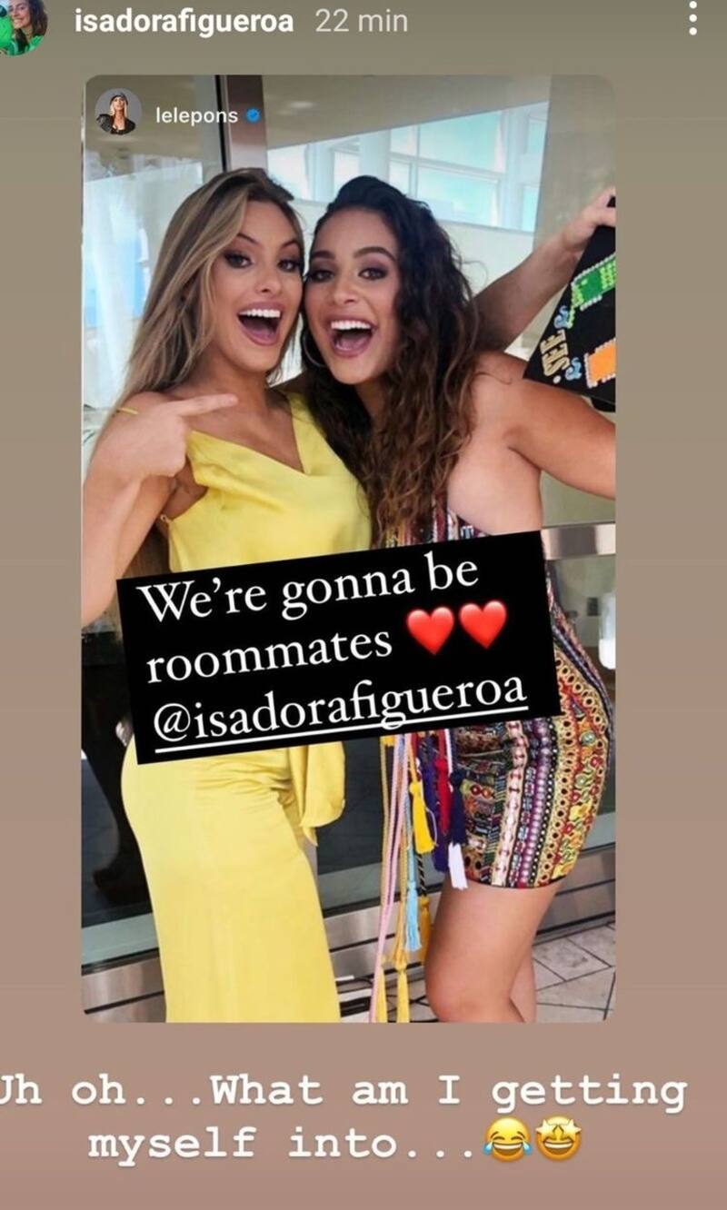 A través de una publicación en sus historias de Instagram, la influencer y cantante compartió con sus fans la buena noticia: Seremos "roommies", con una foto en la que se ven muy felices ambas. "We are gonna be roommates @isadorafigueroa" (Seremos compañeras de cuarto), escribió la cantante en la gráfica que compartió con sus fans.