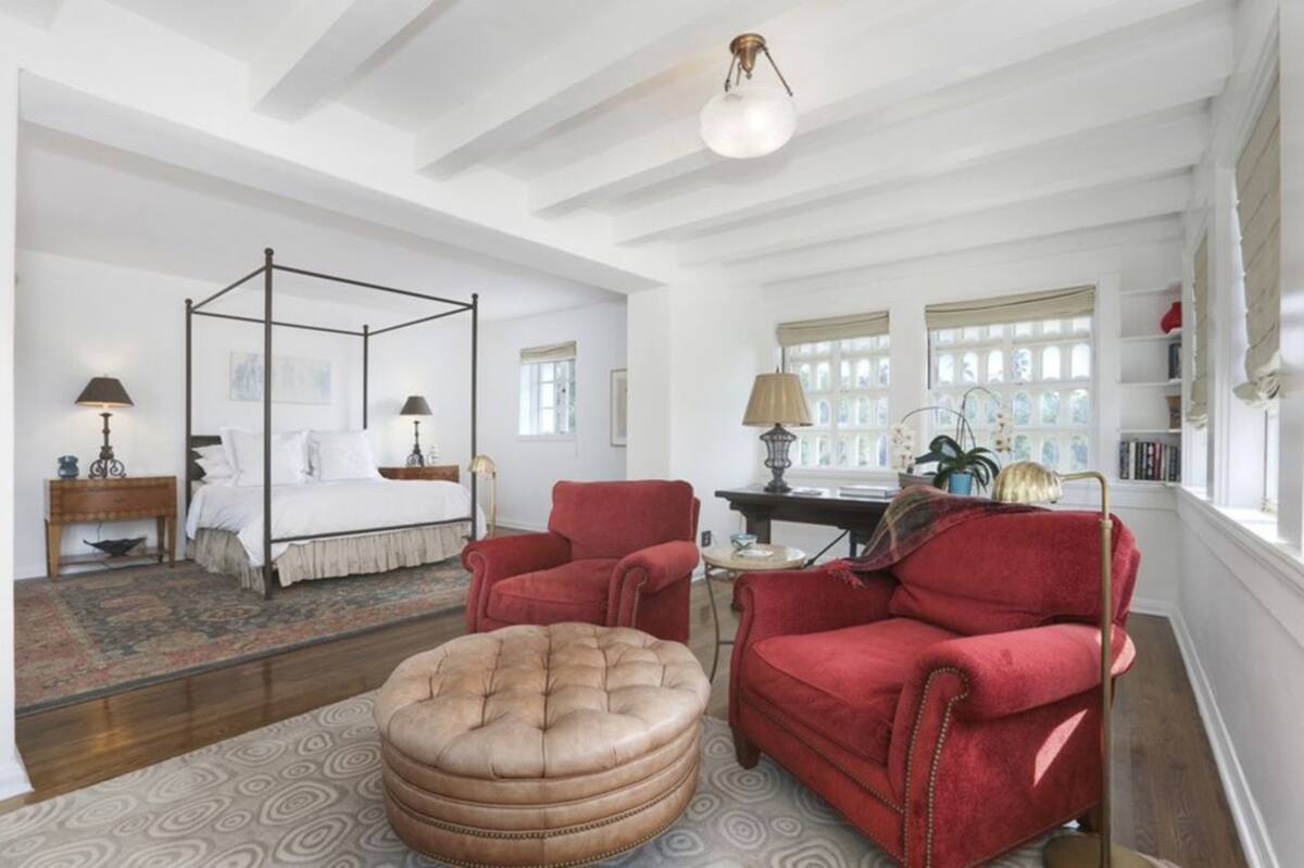En el caso de la habitación de la actriz, las vigas blancas en techo se roban todas las miradas. Posee estanterías arqueadas en las paredes y una sala de estar con unas puertas francesas que conducen a un balcón. También incluye una cada de huéspedes cercana a la casa que fue convertida en garaje.