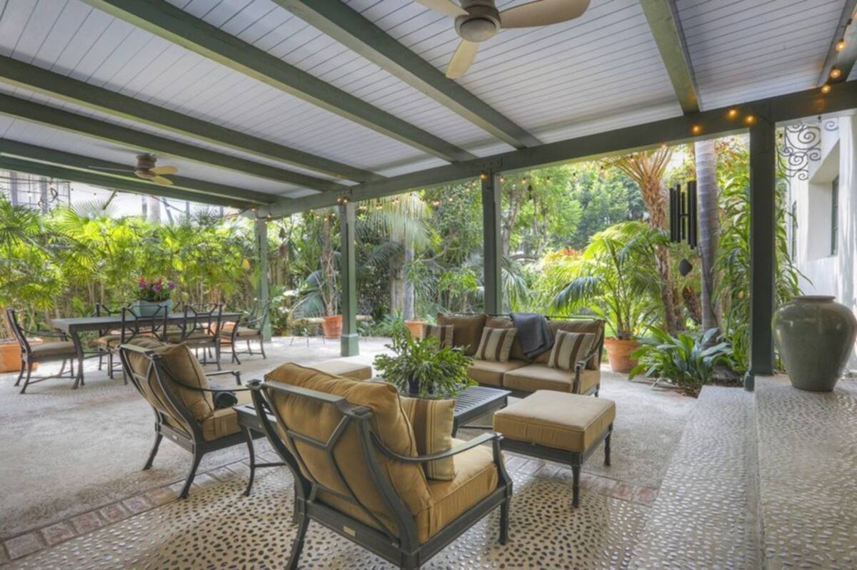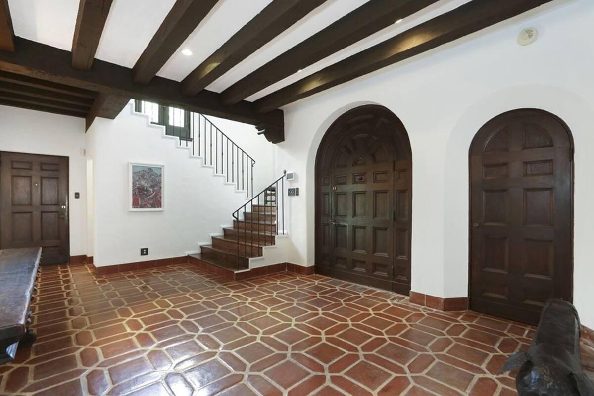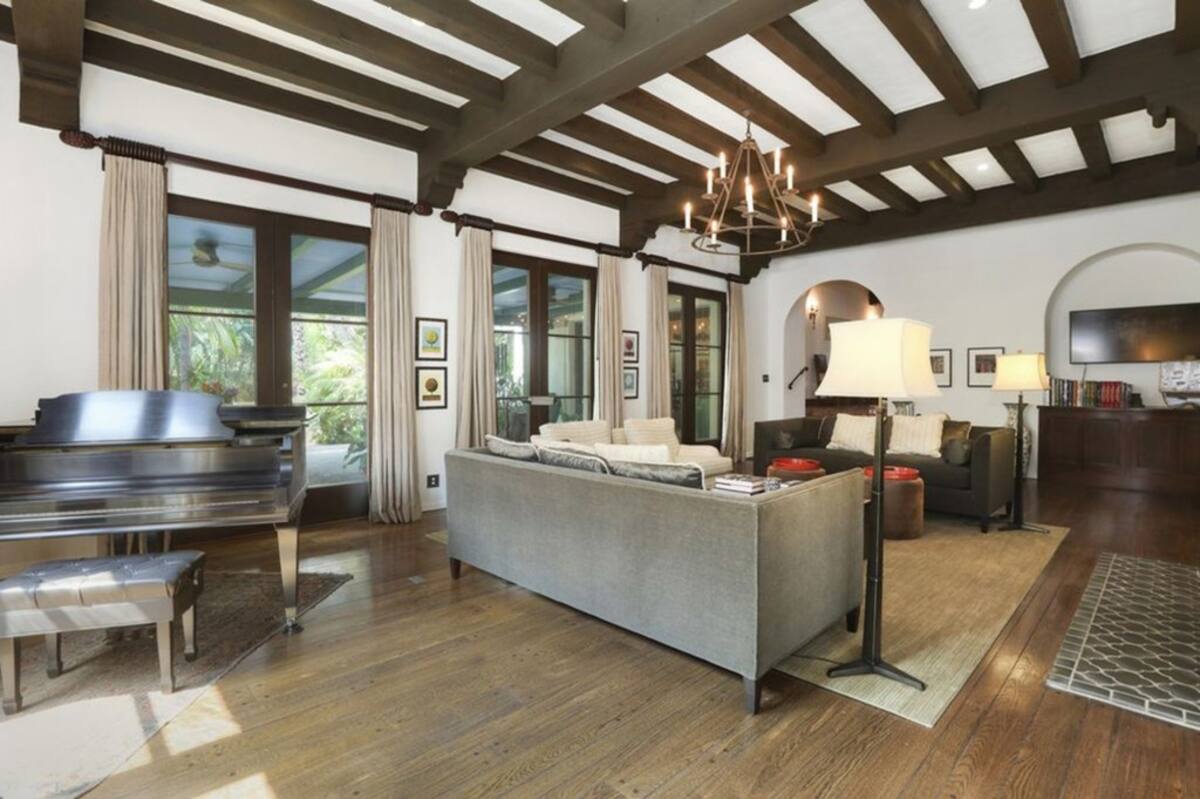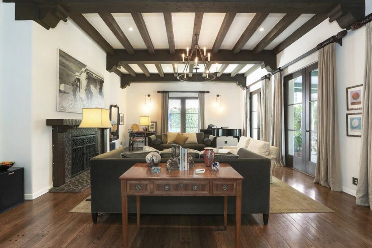 La casa se caracteriza por las tonalidades marrones oscuros y toques de baldosas rojas, con abundantes plantas. Está ubicada específicamente en Los Feliz y tiene techos de tejas rojas clásicas, puertas arqueadas, iluminación de linternas y pisos de madera de roble y tejas combinadas. Además, las vigas del techo son de madera oscura y candelabros de hierro forjado.