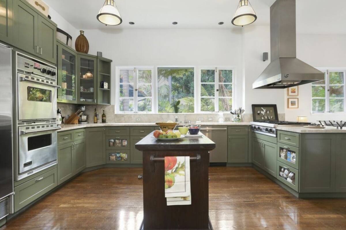 La propiedad de 1500 metros cuadrados posee una sala de estar con una chimenea de azulejos azules acompañado de un comedor con puertas francesas. La cocina se caracteriza por los colores verdes que rodean un horno, refrigerador y quemador doble y una pequeña isla de color negro.