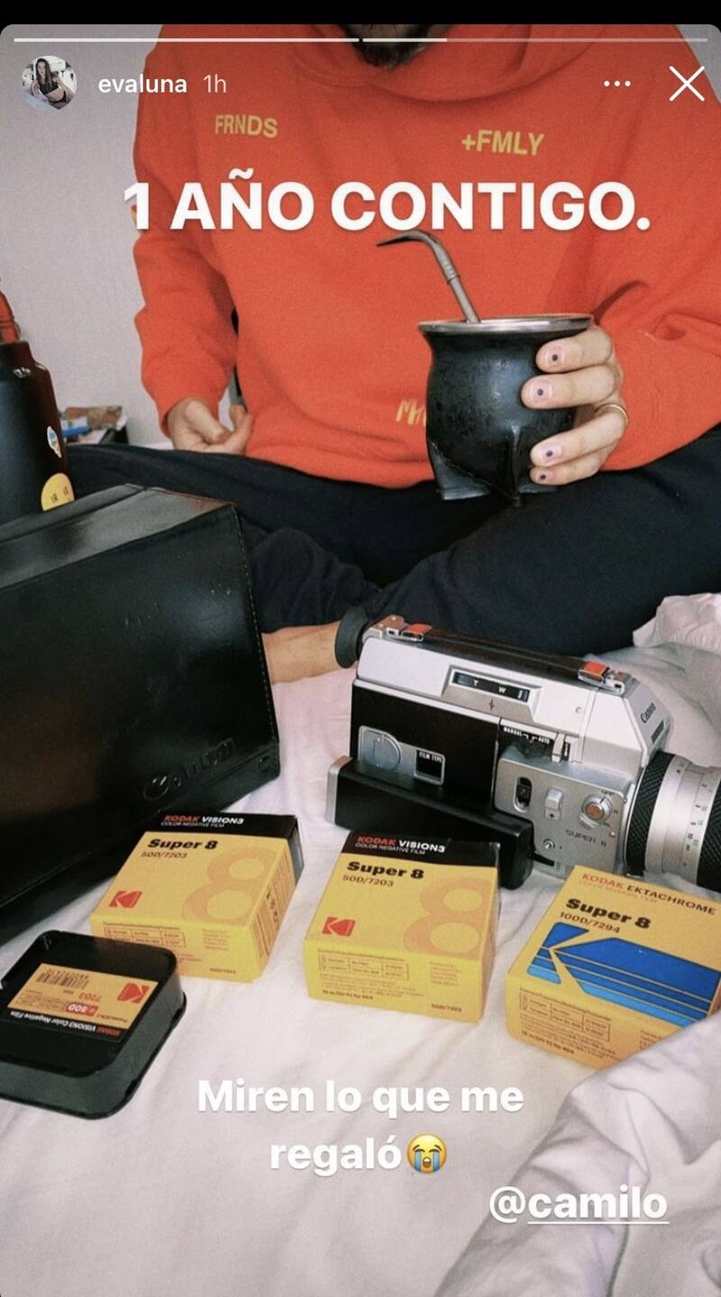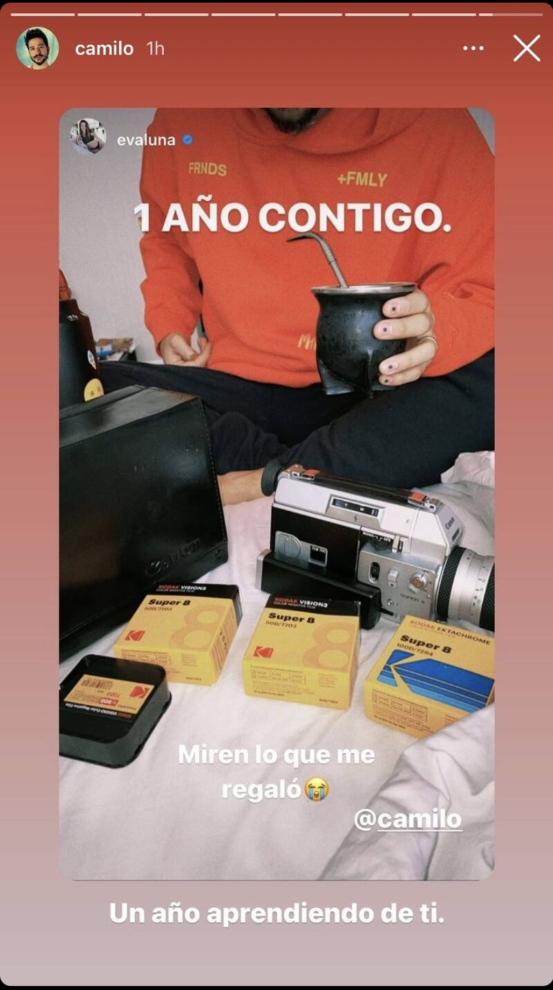 Evaluna también compartió una imagen en sus historias de Instagram, "1 año contigo", escribió junto a una fotografía donde se puede ver a Camilo en el fondo y una cámara, donde agregó: "Miren lo que me regaló". Esta misma fotografía fue reposteada por el cantante, quien agregó: "Un año aprendiendo de ti".