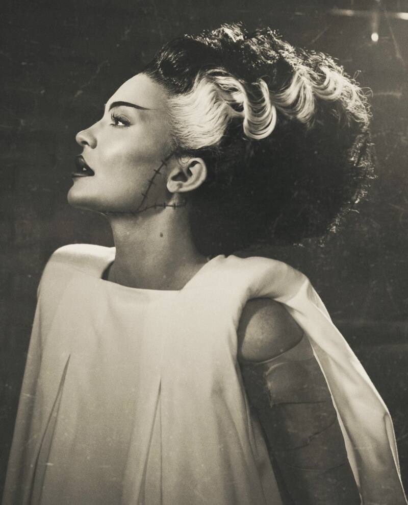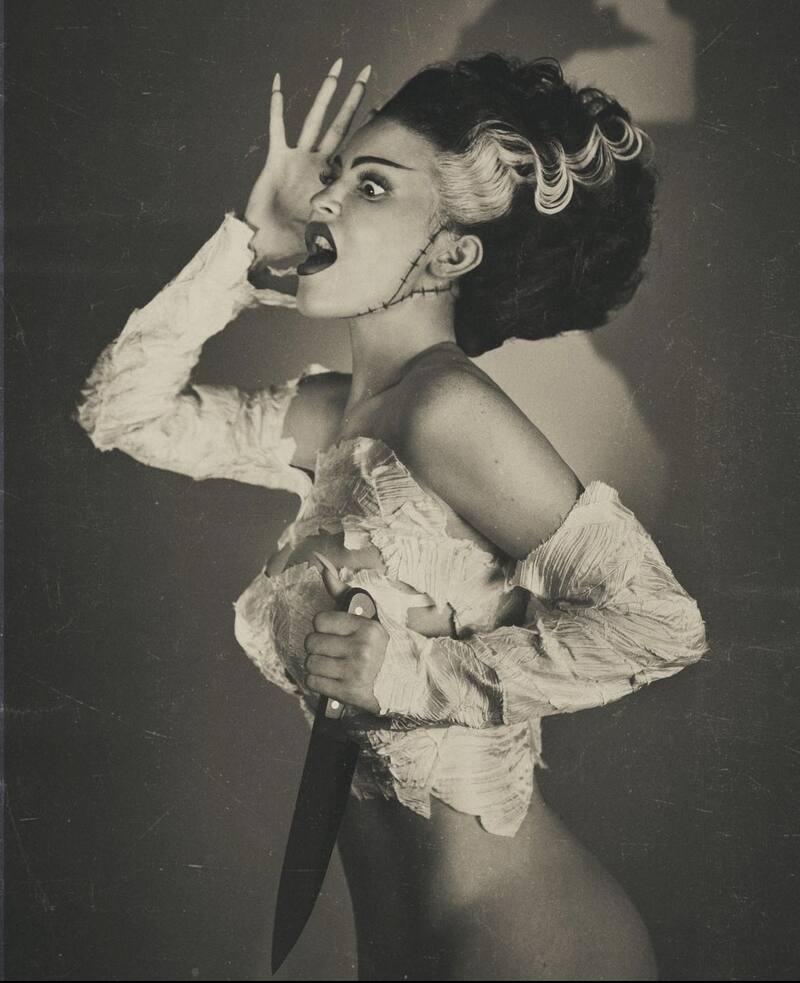Por su parte, Kylie Jenner también sorprendió a sus seguidores disfrazada de la "Novia de Frankenstein", posando en un escenario temático en una sesión de fotos producida imitando las fotos originales de la película. La empresaria compartió imágenes en blanco y negro que canalizan la estética de la película de terror original de 1935 "La novia de Frankenstein".