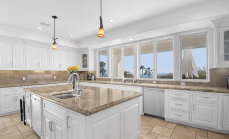 Al igual que en el resto de la casa, prima el color blanco y los tonos café claros. La cocina está conformada por un mueble en el centro y otros en los costados. Además también tiene seis grandes ventanas con vista al mar.