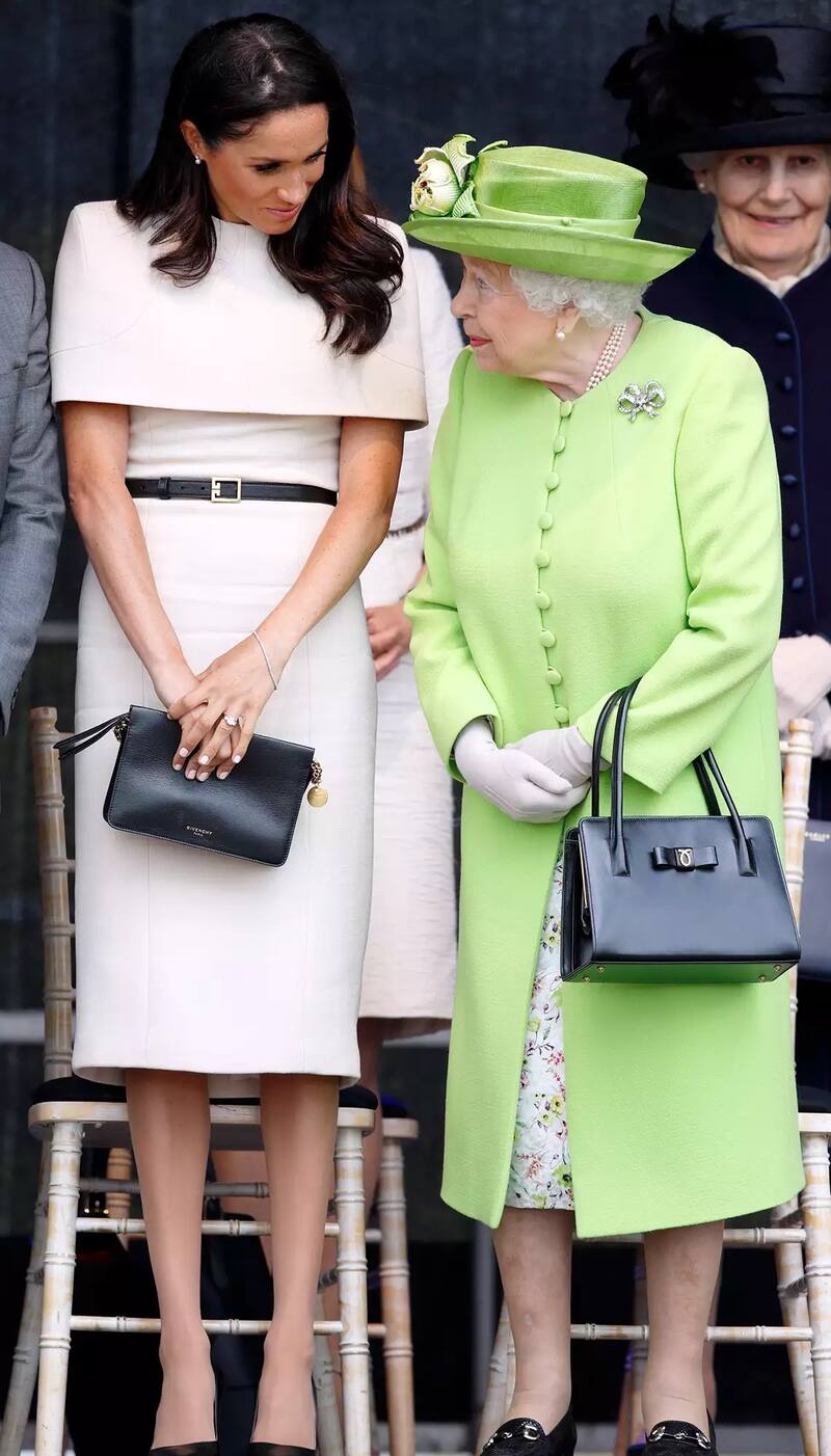 En junio de 2018, la duquesa de Sussex tuvo su primera salida en solitario con la Reina , con quien abrió un nuevo puente en Widnes, Inglaterra. Meghan usó un vestido beige personalizado de Givenchy con un cinturón negro, un bolso negro y tacones a juego.