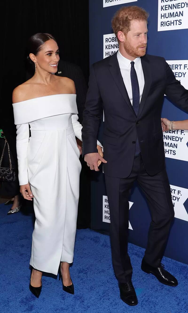 Para la gala del premio Robert F. Kennedy Ripple of Hope en Nueva York, Meghan usó un vestido blanco con hombros descubiertos Louis Vuitton y lo combinó con zapatos negros, aretes colgantes y un elegante moño.