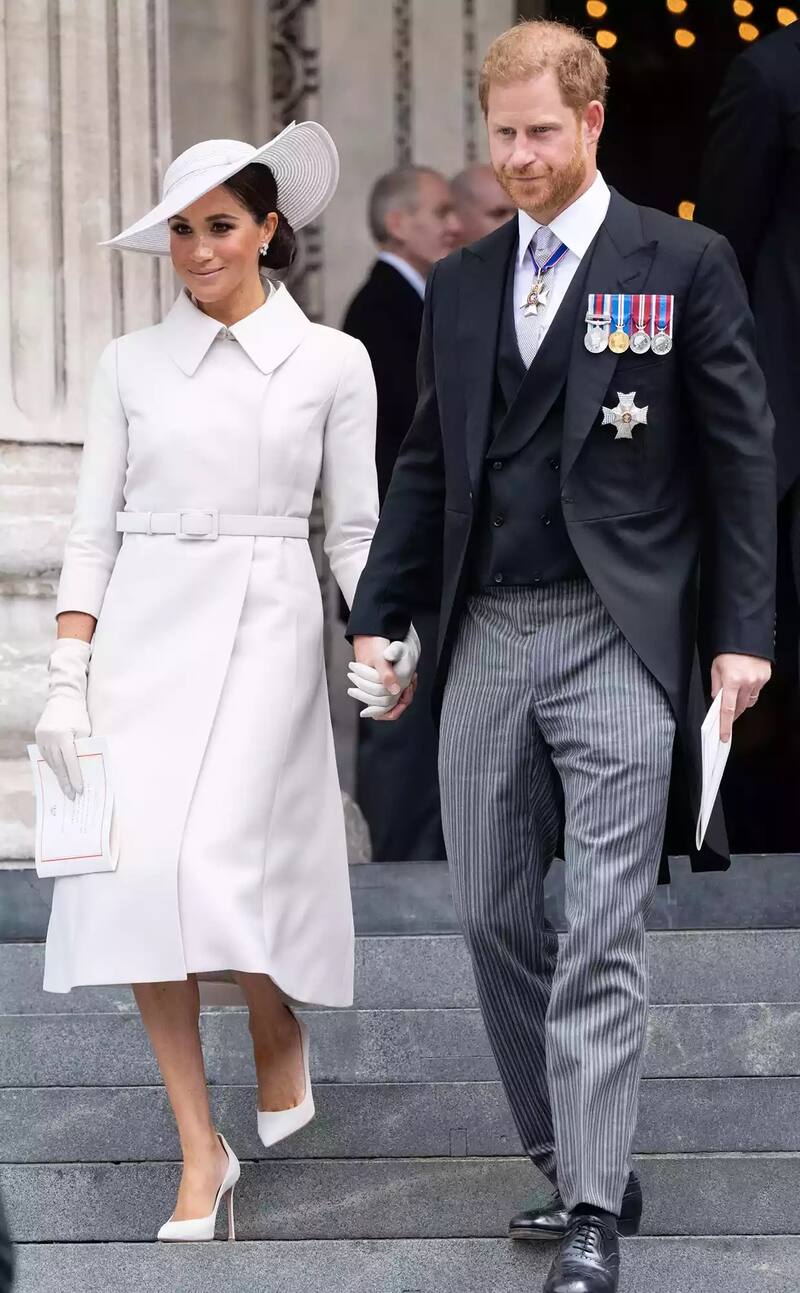 Meghan lució elegante en blanco en las celebraciones del Jubileo de Platino de la Reina en junio de 2022. Llevaba una gabardina blanca piedra y una falda a juego de Dior, así como un sombrero de ala ancha a juego diseñado por Stephen Jones para Dior. Se peinó con un peinado recogido y completó el look con guantes y zapatos Dior, y también unos pendientes Snowflake Snowstorm de Birks.
