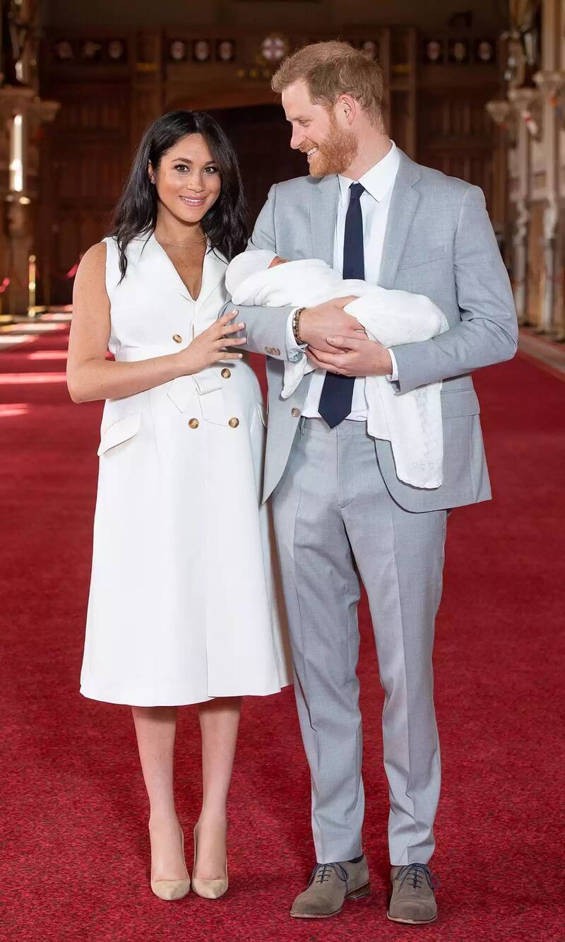 Meghan y Harry presentaron a su hijo recién nacido Archie al mundo en 2019. Meghan usó un vestido blanco sin mangas de la diseñadora británica Grace Wales Bonner. Mantuvo sus accesorios mínimos, con un par de tacones y un delicado collar de oro.