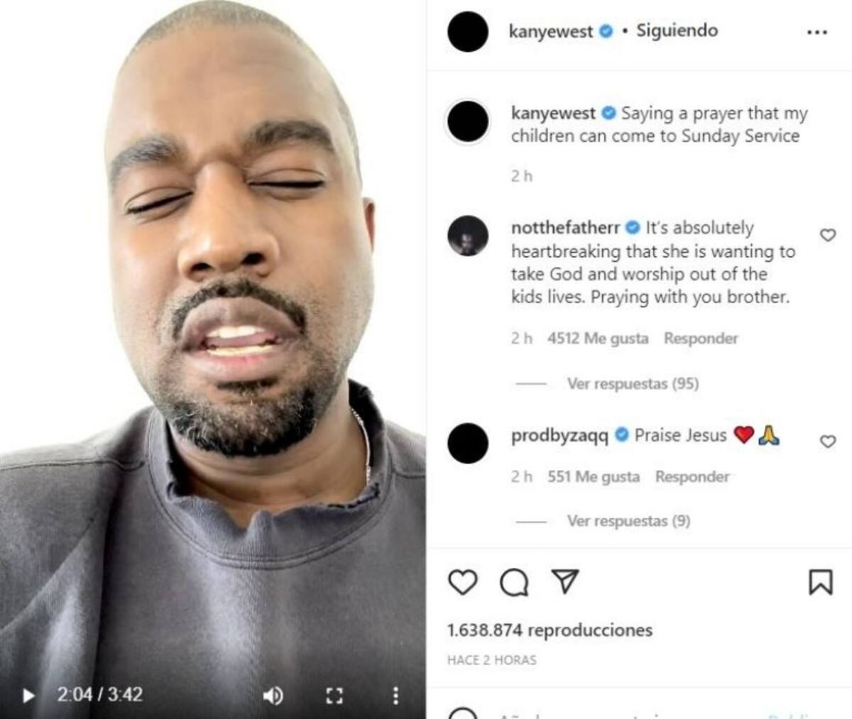 "En este punto está yendo demasiado lejos. Dios, por favor. Su novio me envía un mensaje de texto, me demoniza, se jacta de estar en la cama con mi esposa", alegó el intérprete de "Donda" mediante un video que ya fue eliminado desde su perfil de Instagram.
