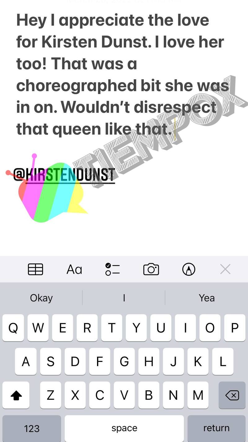 "Aprecio el amor por Kirsten Dunst. ¡Yo también la amo! Fue un momento coreografiado en el que ella estaba involucrada. No faltaría al respecto a esa reina de esa forma", señaló, según resctaron varios medios internacionales.