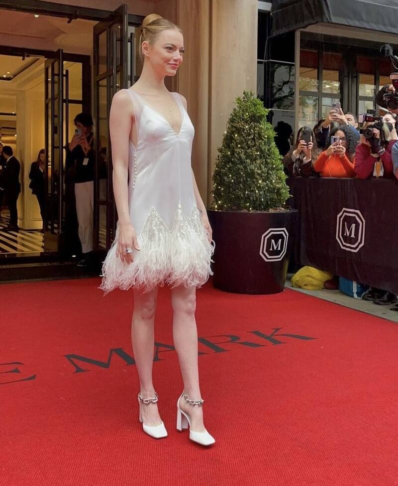 18:06 - Emma Stone sale del hotel y va a camino a la Met Gala, mostrando este atuendo: